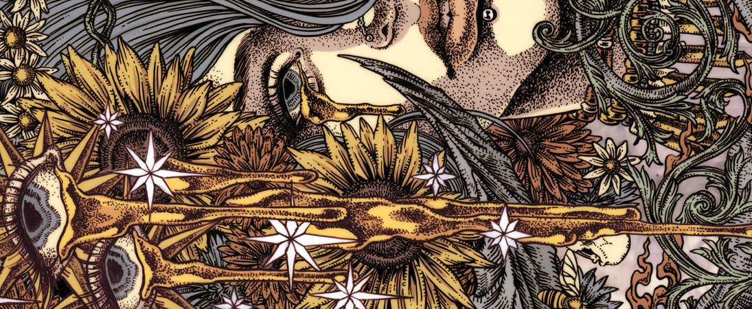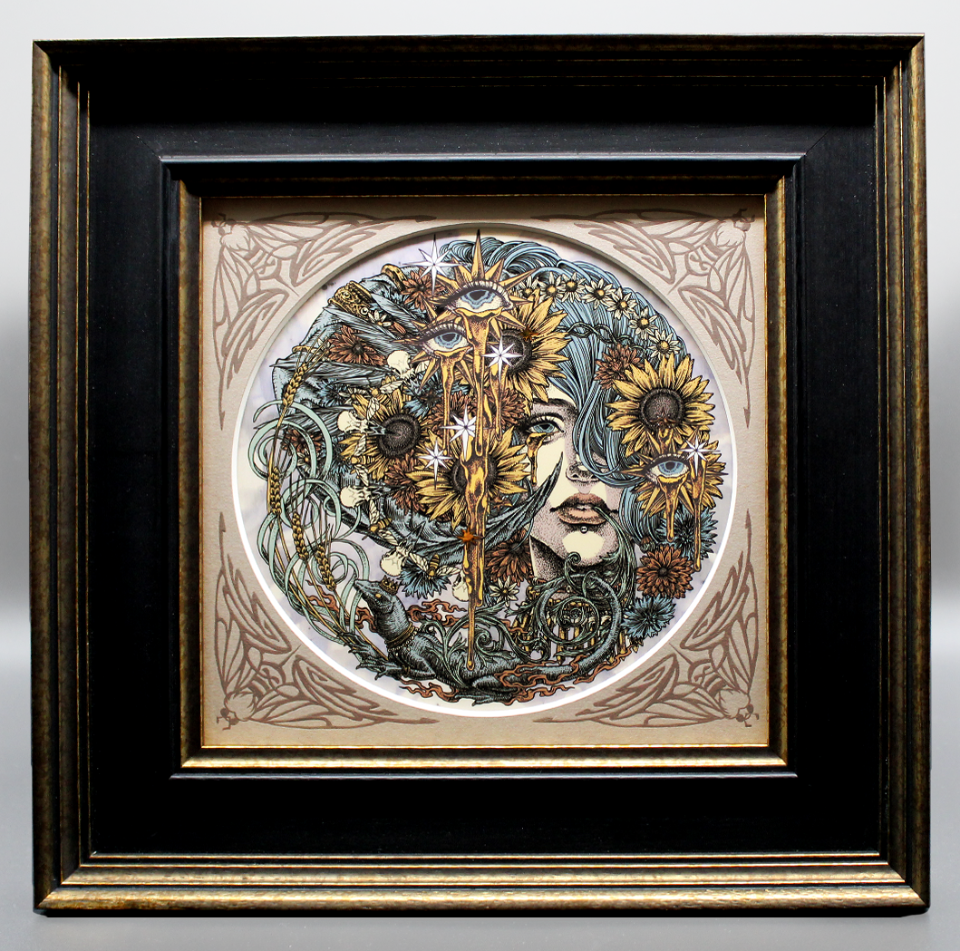 Matte Film. Acrylic Gouache, Dip pen, ink, and Foil.